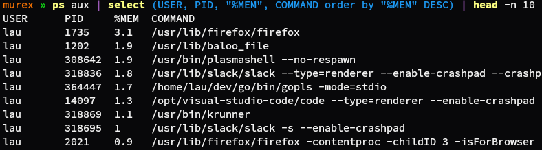 ). This is a way of helping highlight commands that naturally follow after another in a pipeline. Which is particularly important in Murex as it introduces data types and dozens of new builtins specifically for working with data structures in an intelligent and readable yet succinct way.